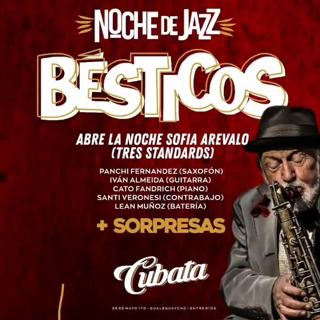Abre la noche Sofía Arévalo (Tres Standards)Pachi Fernandez (saxofón)Iván Almeida (Guitarra)Cato Fandrich (Piano)Santi Veronesi (Contrabajo)Lean Muñoz (Batería)+ SORPRESAS @cubatabar_gchu